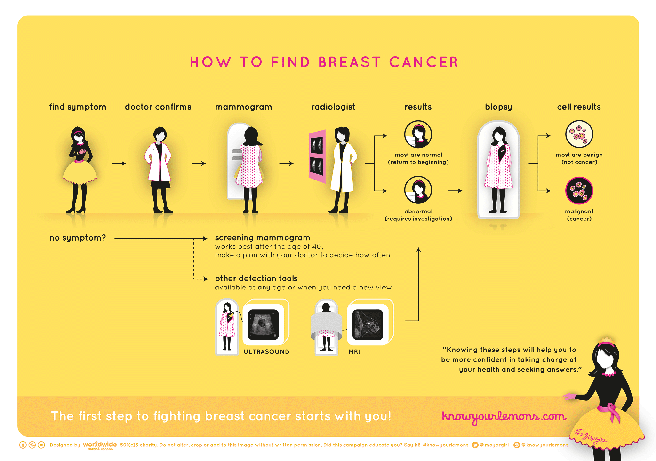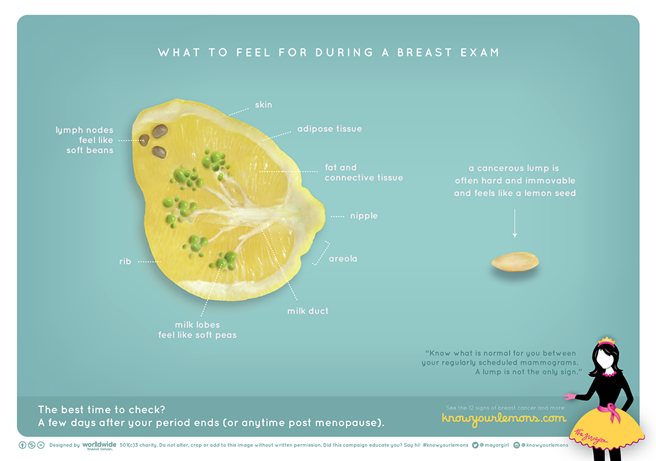 A través de diferentes inforgrafías en las que se representan los pechos femeninos con limones y bajo el hashtag #knowyourlemonsla campaña señala todos los pasos necesarios que deben seguir las mujeres en caso de notar cambios en sus pechos: desde la revisión en casa hasta los pasos a seguir con un médico.
