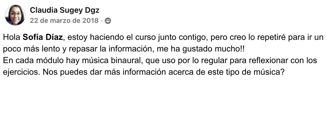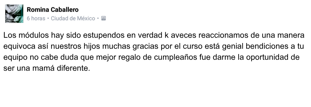 “Los módulos han sido estupendos. En verdad que a veces reaccionamos de una manera equívoca con nuestros hijos. Muchas gracias por el curso. No cabe duda que el mejor regalo de cumpleaños fue darme la oportunidad de ser una mamá diferente.”
