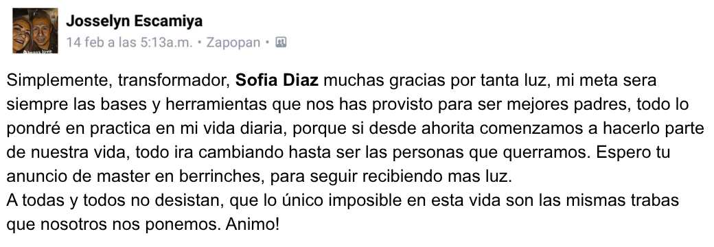 “Simplemente, transformador, Sofia Díaz muchas gracias por tanta luz, mi meta será siempre las bases y herramientas que nos has provisto para ser mejores padres, todo lo pondré en practica en mi vida diaria.