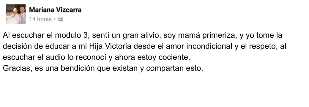 “Al escuchar el módulo 3 sentí un gran alivio. Soy mamá primeriza y yo tomé la decisión de educar a mi hija Victoria desde el amor incondicional y el respeto, al escuchar el audio lo reconocí y ahora estoy conciente.