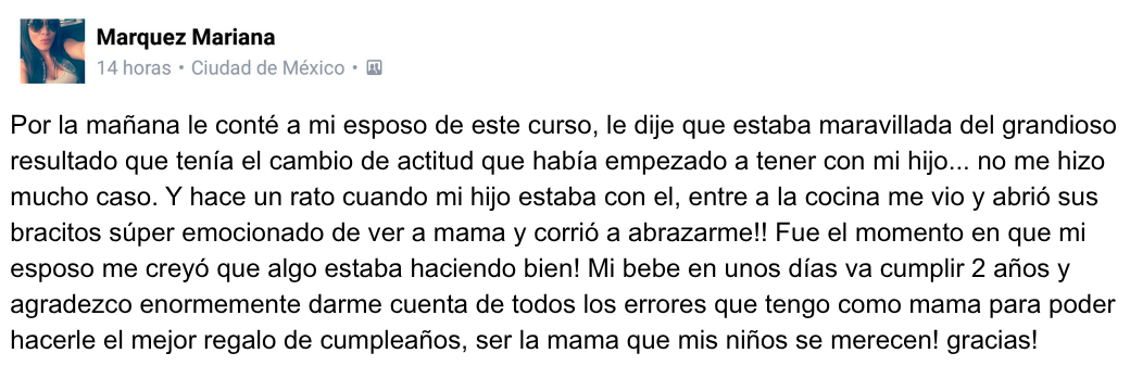 “Por la mañana le conté a mi esposo de este curso, le dije que estaba maravillada del grandioso resultado que tenía el cambio de actitud que había empezado a tener con mi hijo… no me hizo mucho caso. Y hace un rato cuando mi hijo estaba con él, entré a la cocina me vio y abrió sus bracitos súper emocionado de ver a mamá y corrió a abrazarme!! Fue el momento en que mi esposo me creyó que algo estaba haciendo bien! Agradezco darme cuenta de todos los errores que tengo como mamá para poder hacerle el mejor regalo de cumpleaños, ser la mamá que mis niños se merecen! 🙏🏼 gracias!”