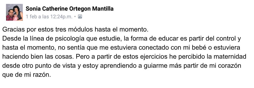 “Gracias por estos tres módulos hasta el momento. Desde la línea de psicología que estudié, la forma de educar es partir del control y hasta el momento, no sentía que me estuviera conectado con mi bebé o estuviera haciendo bien las cosas. Pero a partir de estos ejercicios he percibido la maternidad desde otro punto de vista y estoy aprendiendo a guiarme más partir de mi corazón que de mi razón.”